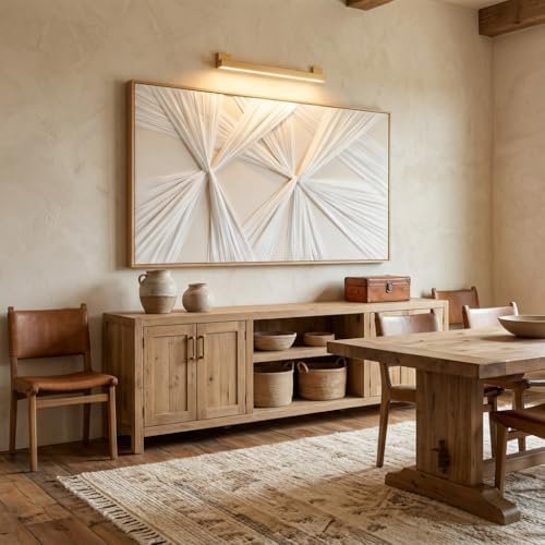 - 【Modern Boho Design & Statement Size】Bring character to your home with this 54″W x 27″H horizontal fabric wall art, merging modern aesthetics with cozy boho art texture. The handcrafted 3D fabric weaving adds movement and depth, creating a captivating abstract wall art that transforms any blank wall into a gallery moment. Framed in natural wood grain, this large canvas wall art combines elegance and warmth—perfect for your wall decor living room or modern bedroom wall art setup.