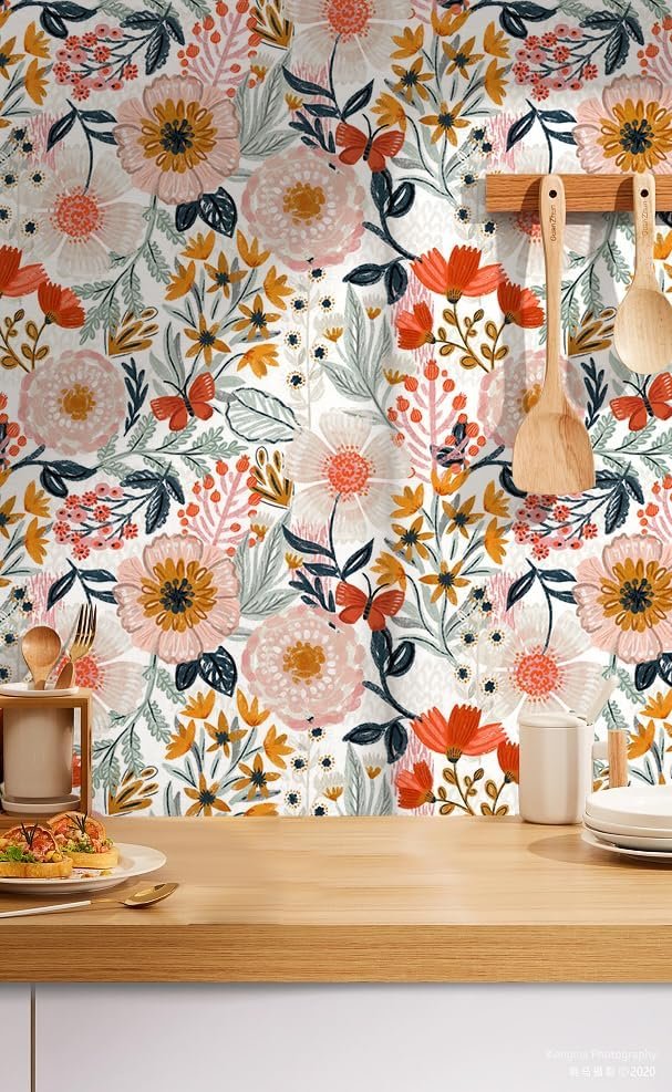 HAOKHOME Boho Peel and Stick Wallpaper Floral Wall Paper Removable for Bedroom White/Pink/Orange Contact Paper 17.3in x 9.8ft –