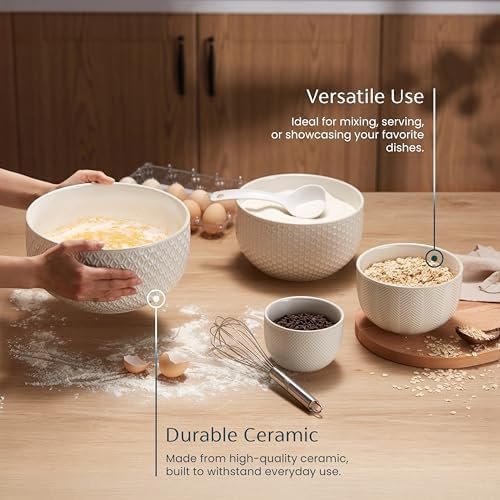 KooK Ceramic Mixing Bowls, Nesting Set of 4, Embossed Kitchen Dishware, Prep, Serving, Gift, Microwave and Dishwasher Safe, 20/44/98/145 oz, Narbonne Collection (Ivory): Home & Kitchen