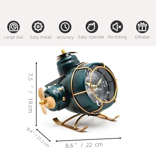 | Feature | Metal material:This steampunk airplane table clock is crafted from high-quality metal, featuring an all-metal body, a rotating propeller, and a classic green-and-gold color scheme. Its exquisite details showcase an elegant vintage style. Dimensions: 8.6 x 8.4 x 7.5 inches |