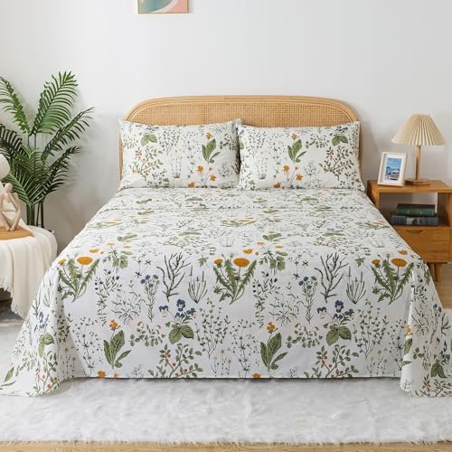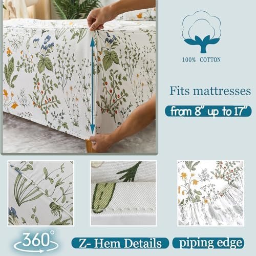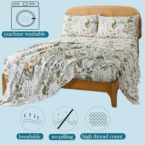Zusbest Queen Sheet Set 100% Percale Cotton Green Floral Bed Sheet Set Yellow Flower & Green Leaves Botanical Pattern Printed on White Garden Luxury Crisp Soft Deep Pocket Fitted Sheet 17.5” 4Pcs : Home & Kitchen